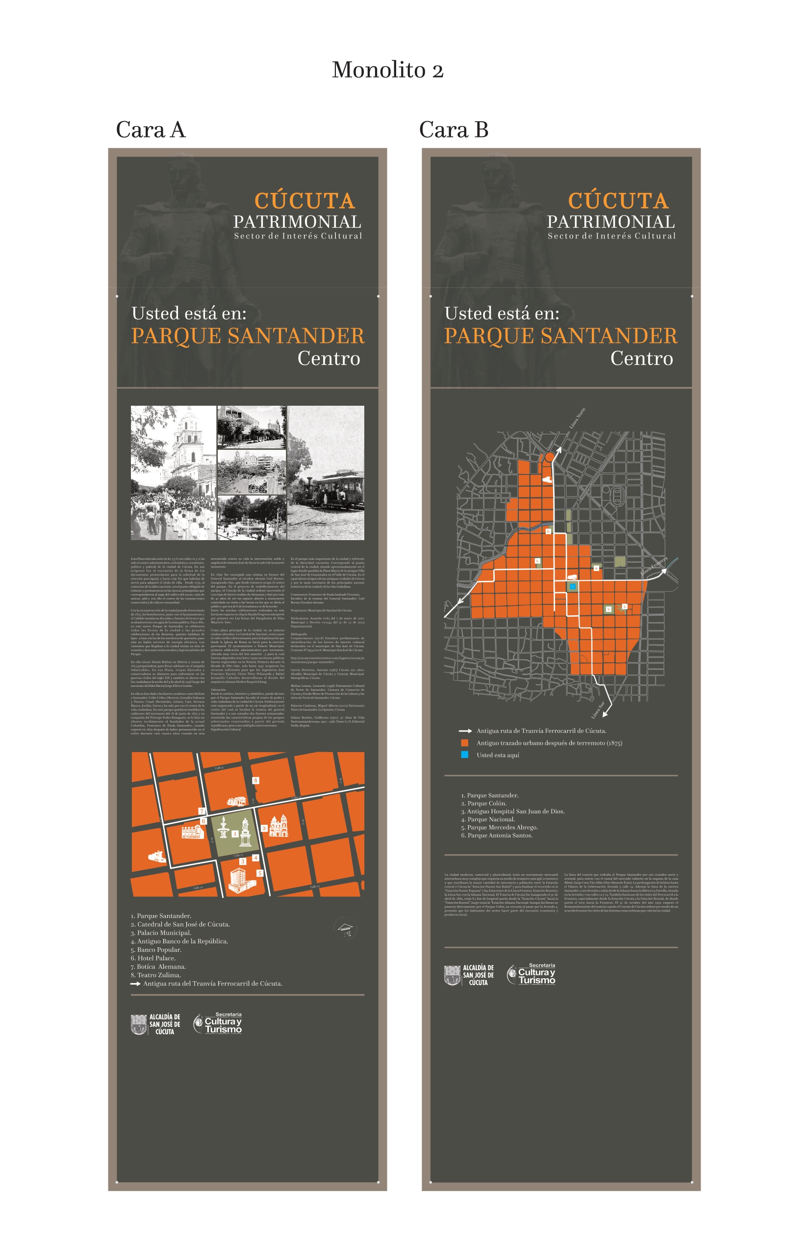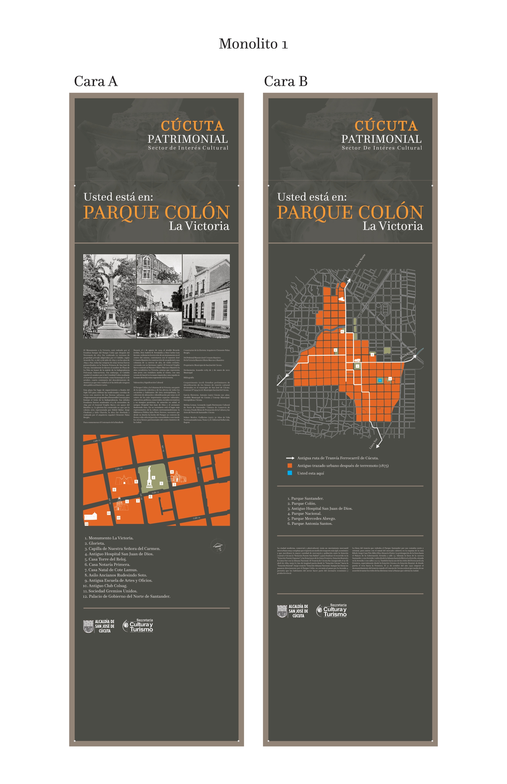 Realizamos en el año 2019 el contenido de información patrimonial y se diseñó gráficamente el infograma registrado en los monolitos de señalización turística de diez (10) Bienes de Interés Cultural- BIC , elementos producidos e instalados en el espacio público del municipio de San José de Cúcuta.